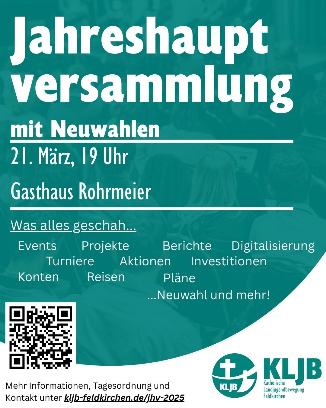 hiermit laden wir, die Vorstandschaft der KLJB Feldkirchen, euch herzlich zu unserer Jahreshauptversammlung mit Neuwahlen am 21.3.2026 ein.
